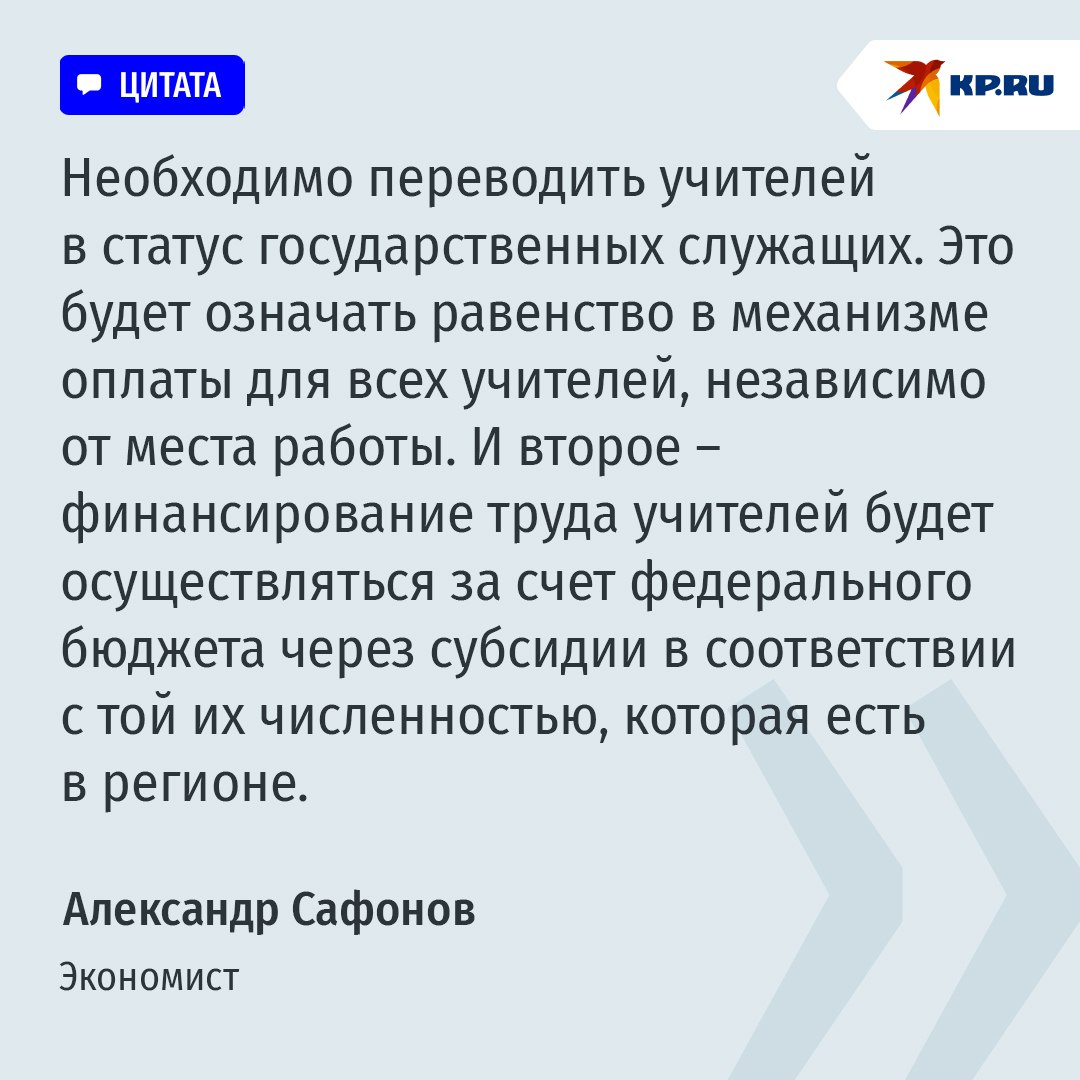 KP.RU спросил у экономиста Александра Сафонова поможет ли эта мера удержать педагогов в регионах? Спойлер: может не сработать, ситуацию следует решать комплексно. Важный компонент реформы, по словам эксперта, – оклад учителя должен составлять не менее 70% от общего заработка. И только 30% должны складываться из стимулирующих выплат. Сейчас нередко получается наоборот. При этом, если денег не хватает, стимулирующие надбавки сокращаются в первую очередь – часто по субъективному решению директора школы.