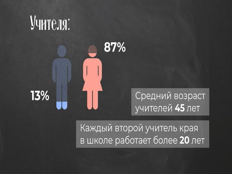 Подавляющее большинство сотрудников школы — это женщины. Средний возраст педагогов края — 45 лет. Больше половины учителей в общеобразовательных учреждениях работают более 20 лет.