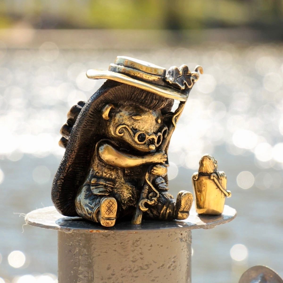 Дедушка Ёж и его рыбка Буль. Этот герой – мудрец, посидеть рядом с ним на причале приходят, когда нужно принять какое-то решение и собраться с мыслями. Дедушка с удочкой сидит на берегу неслучайно: он отражает неспешность и размеренность, а пойманная рыбка Буль в латунном ведре символизирует удачу. Это новая фигурка. Её установили в этом году.