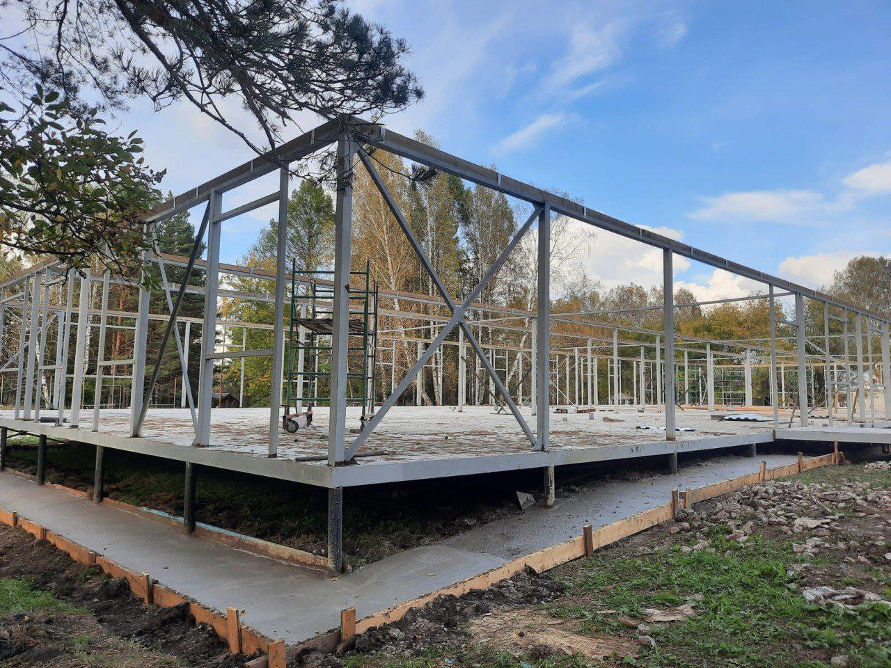 Сейчас рабочие монтируют на территории модульные здания. Возводят два жилых корпуса, современный пищеблок, медицинский пункт с изолятором.
