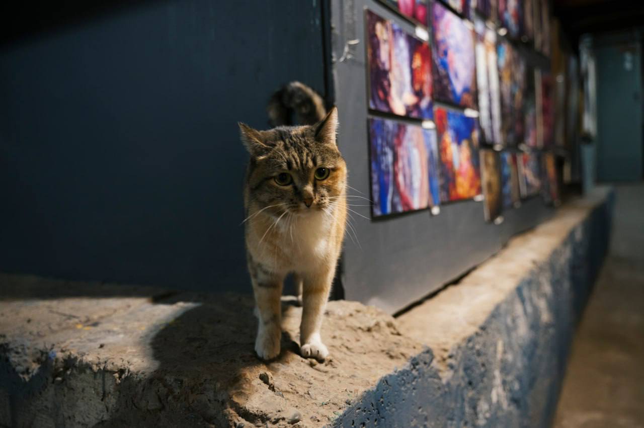 Мурчащий сотрудник музея "Площадь Мира" Муся на страже современного искусства.
