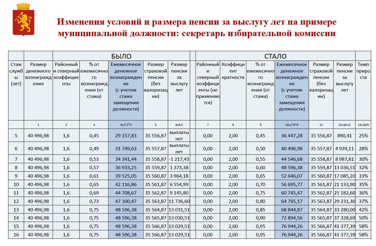 Данные опубликовал депутат Павел Мокин. По его словам, проект обсудили на заседании комиссии по местному самоуправлению. Депутат представил таблицу, в которой рассмотрено повышение пенсии на примере секретаря избирательной комиссии с зарплатой в 40 тысяч рублей. На данный момент пенсия для сотрудника с 5-летним стажем составляет 29 тысяч рублей. После повышения уже 36,5 тысяч.