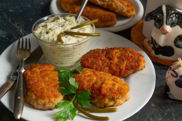 Готовые котлеты подаются горячими с соусом тартар на отдельной тарелке, украшенные зеленью и чесночными стрелками. И, конечно, идеальным гарниром станет картошка — вареная или в виде пюре, что сделает обед по-настоящему незабываемым.