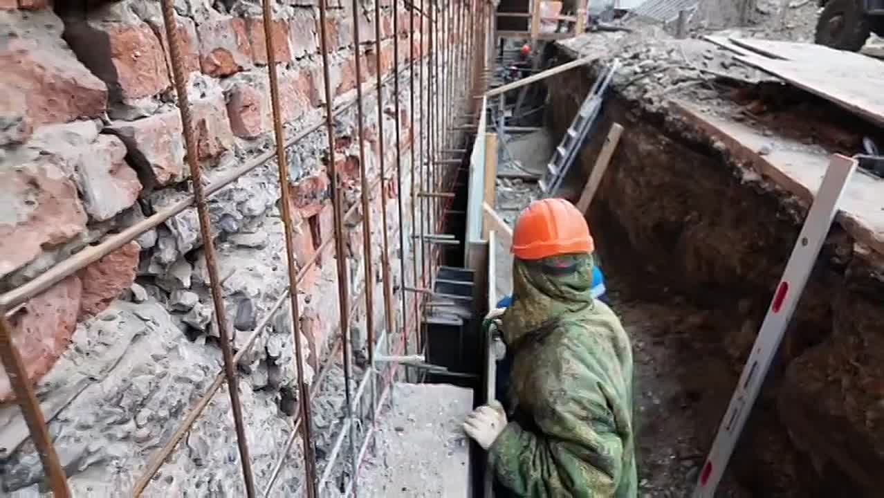 Работы по вдавливанию свай по периметру всего многоквартирного дома продолжаются.