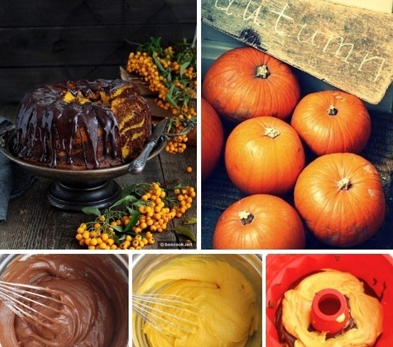 Теперь всё готово для формирования кекса! Выложите поочередно в форму 2-3 столовые ложки шоколадного и тыквенного теста. Для создания мраморного эффекта используйте деревянную шпажку, делая плавные круговые движения, соединяя тёмное и светлое тесто.