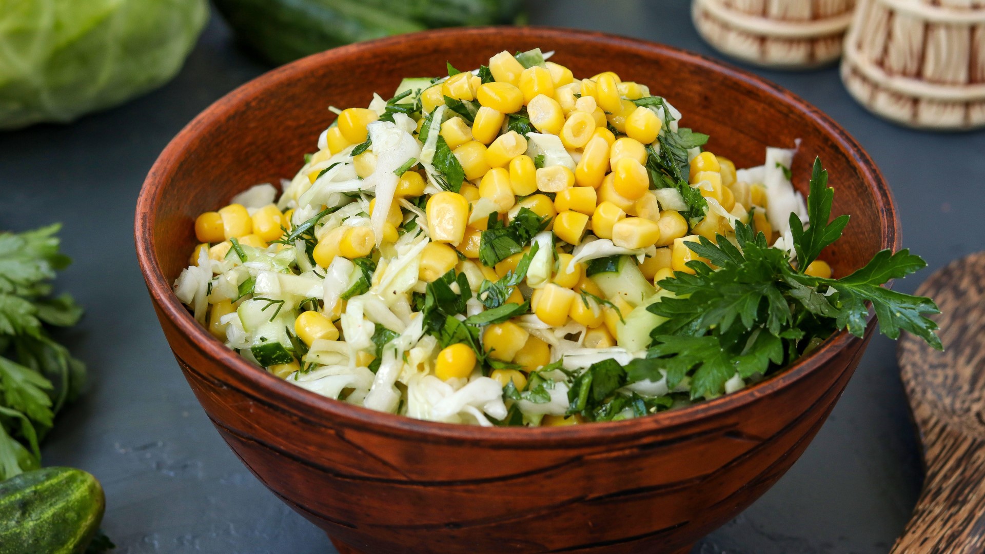 Вкусный овощной салат — это не только «Греческий» и помидор с огурцом. Попробуйте приготовить это блюдо с кукурузой. Оно получается вкусным и оригинальным, а на весь процесс уходит не более 15 минут.