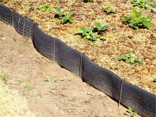 - Ограждение для грядок: Поднятые огороженные грядки не только удобны, но и красиво смотрятся. Шины, разрезанные и уложенные в виде бордюра, могут стать отличным вариантом такого ограждения.