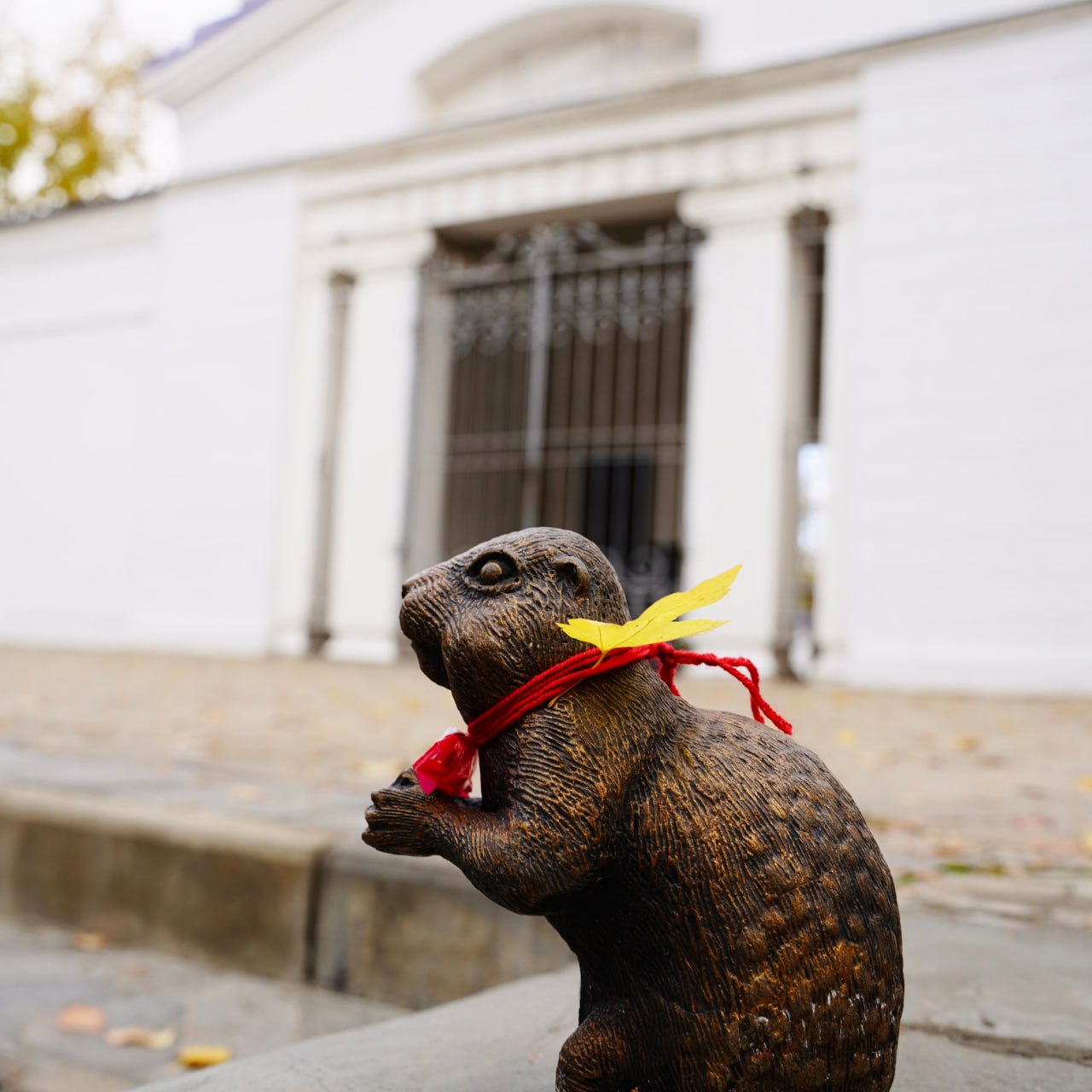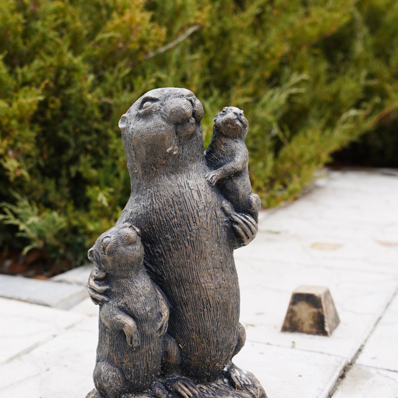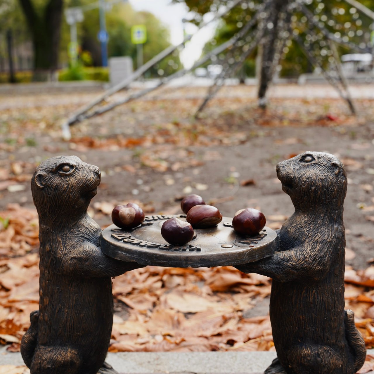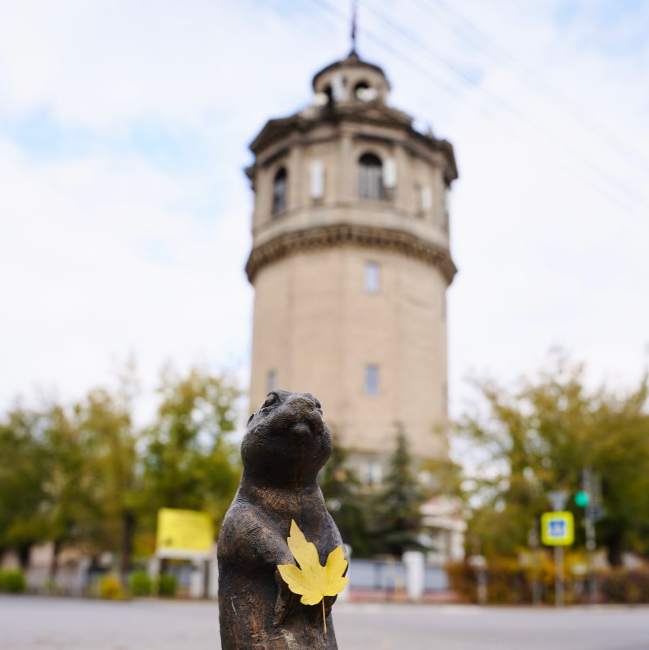 Гуляя по площади Строителей мы встретим парочку сусликов, которые держат знак «Нулевой километр». Именно отсюда начинаются все дороги и маршруты, которые оберегают бронзовые скульптуры.