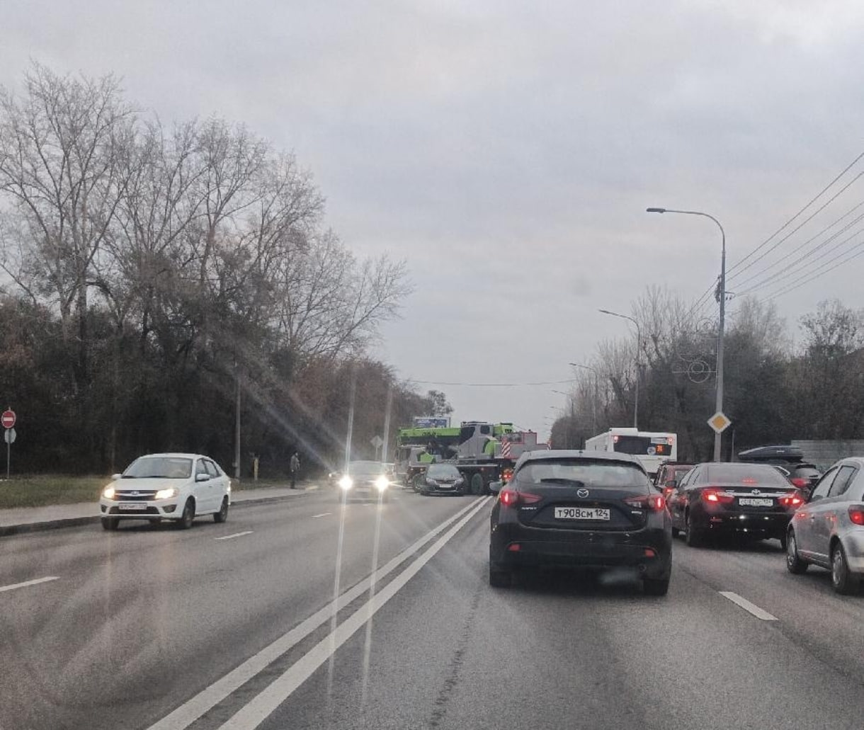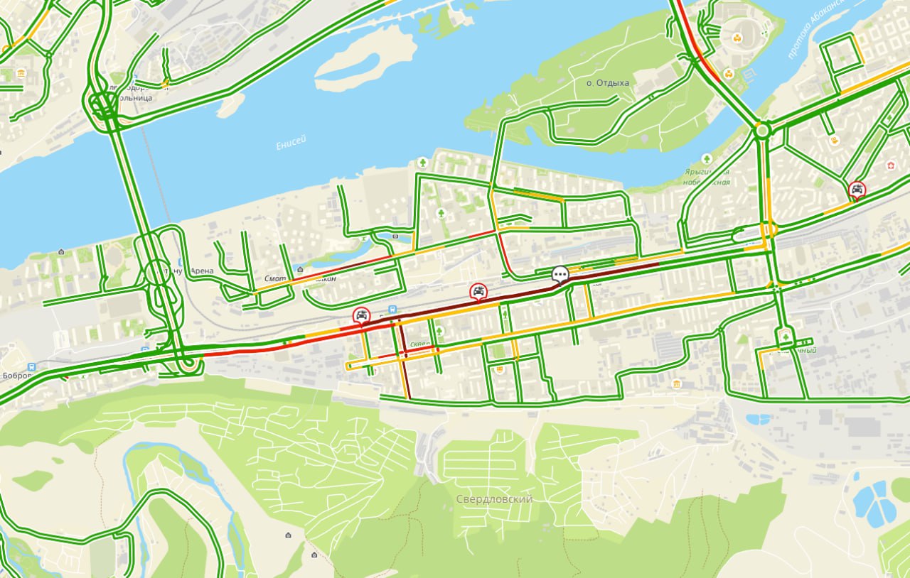 Судя по фото из 2ГИС, в районе станции «Енисей» произошла авария, дорога частично перекрыта. Пробка растянулась от остановки «Художественное училище».