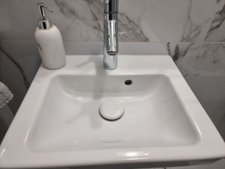 Затем смойте пену водой и протираю раковину сухой тряпкой или бумажным полотенцем.