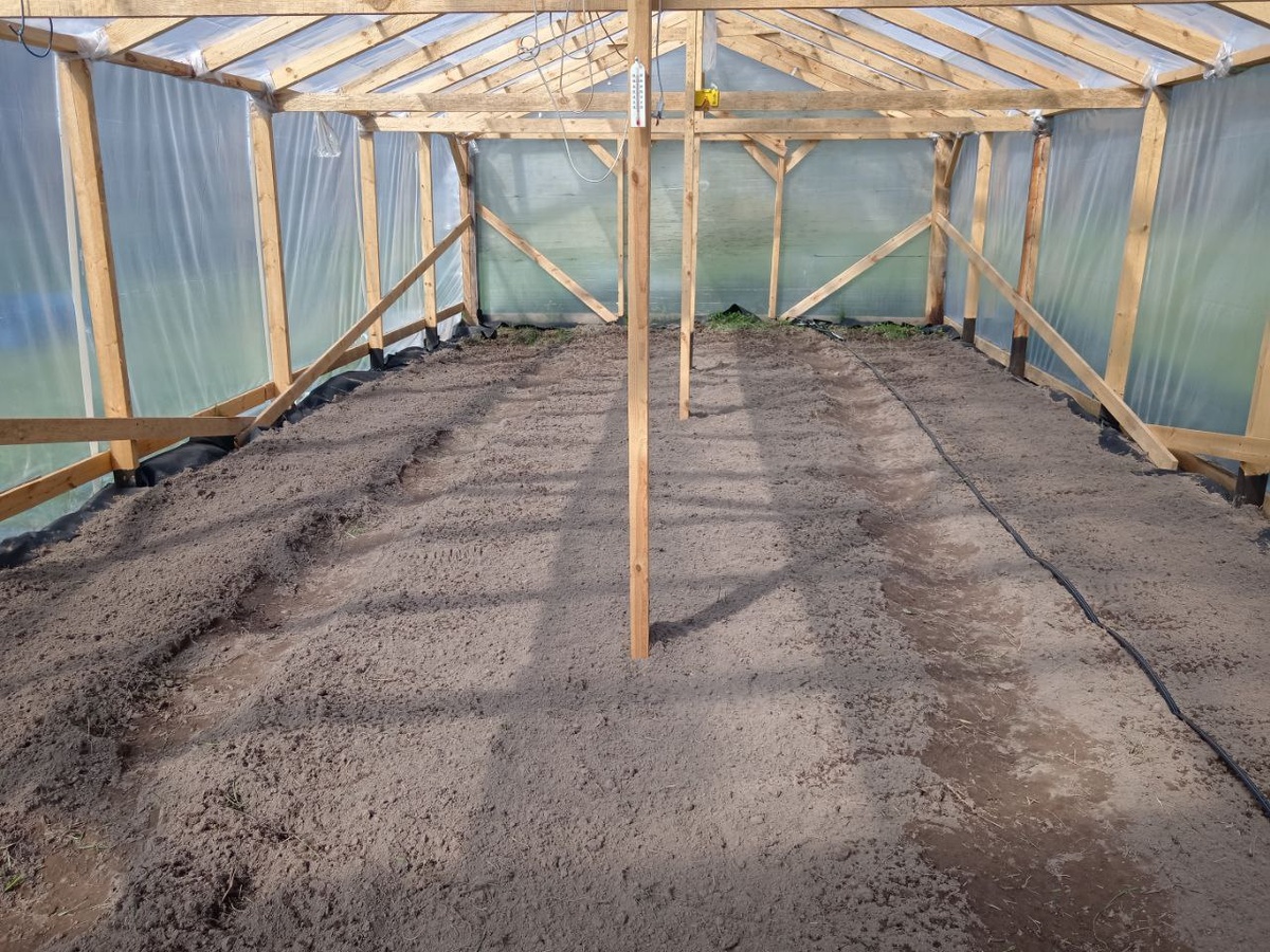 - Томаты: В большой теплице высажены томаты с интервалами 40 см между кустами и 60 см между рядами. Таким образом, удалось разместить около 120 кустов, что обещает богатый урожай.