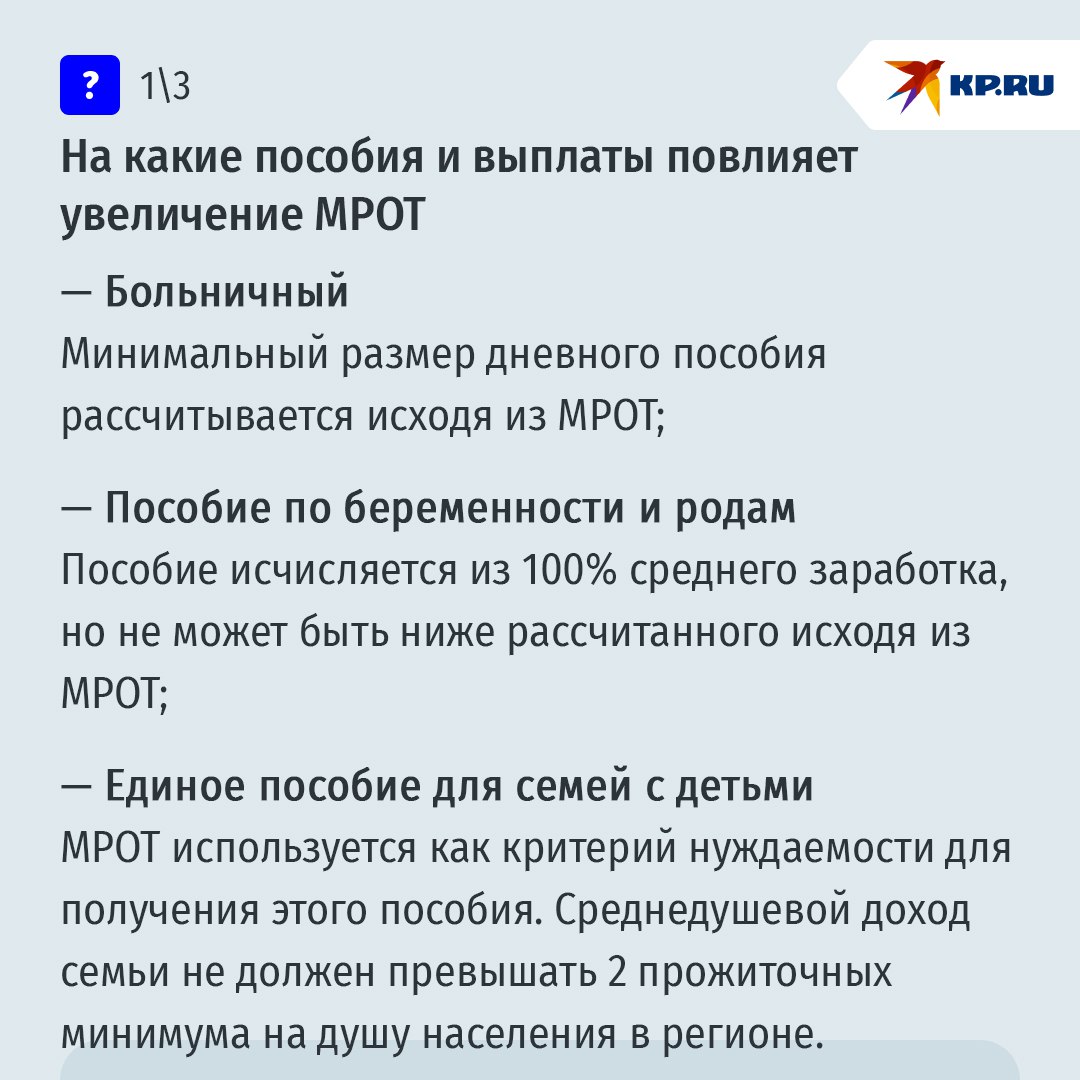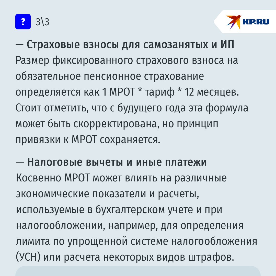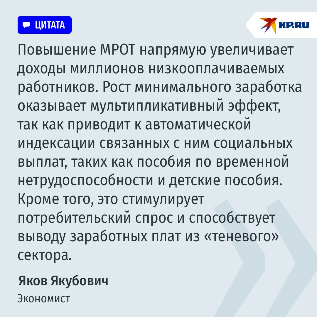 Профессор Финансового университета при правительстве РФ Александр Сафонов рассказывал ранее, что повышение МРОТ повлияет на "выход из тени" зарплаты части сотрудников сфер малого и среднего бизнеса, которым минимальная оплата, равная МРОТ, платится официально, а остальная сумма в конверте. Кроме того, вырастут зарплаты в бюджетном секторе, где зачастую установлены низкие оклады, а основная часть зарплаты приходится на надбавки и доплаты. Повышение МРОТ приведет к пересмотру базовых окладов.