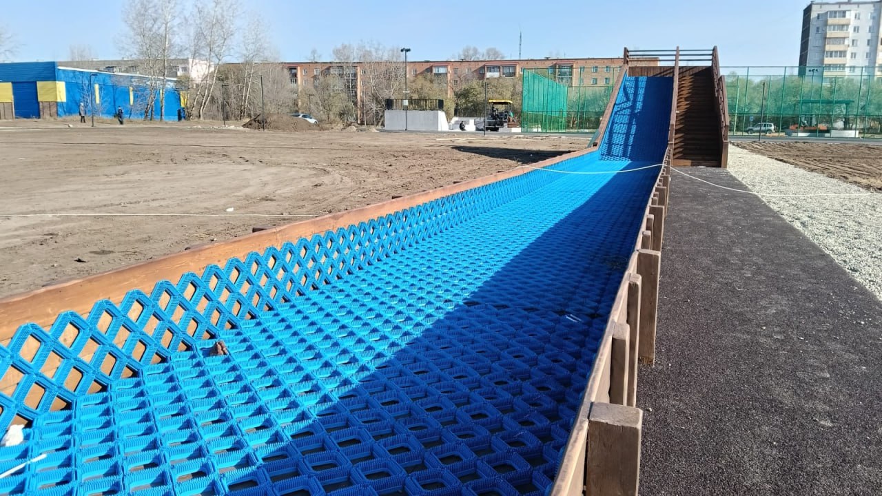 Периметр парка охвачен тротуарами и велосипедными дорожками, а в центре разместилась тюбинг-горка. По просьбе жителей включили в проект и площадку для выгула собак.
