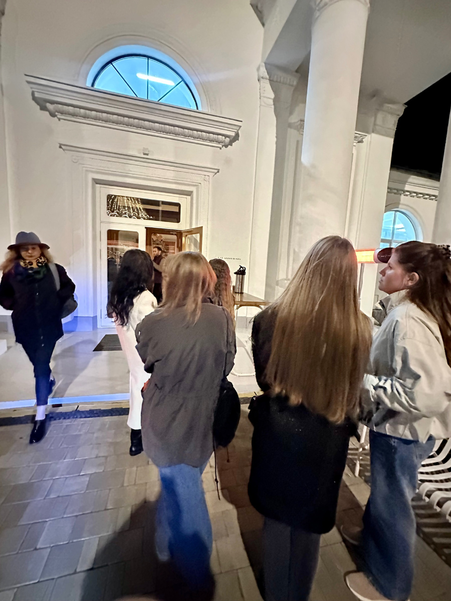 Интерьер кафе притягивает своим уникальным стилем: высокие потолки, колонны и элементы советского ретро с современным акцентом в дизайне. Теплые, приглушенные тона создают уют, а большой промышленный вентилятор под потолком добавляет шарма.