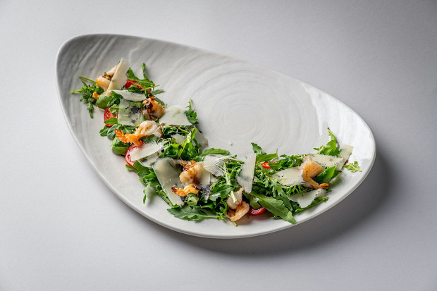 5. На красивом блюде разместить подготовленную руколу, сверху аккуратно выложить горячие креветки, дополнить кусочками помидоров черри и щедро посыпать хлопьями пармезана.