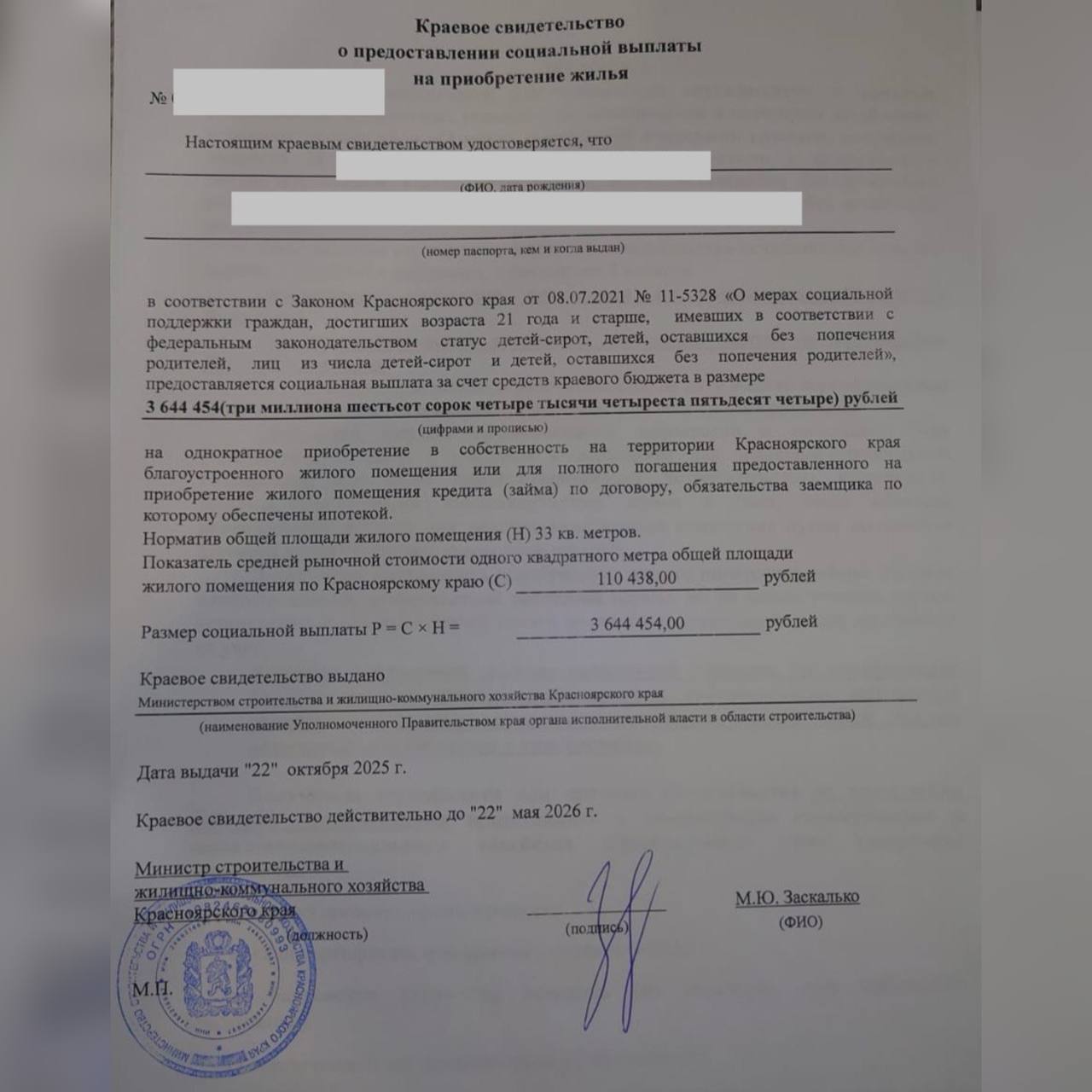 После этого сироты получили региональные сертификаты на приобретение собственного жилья общей стоимостью более 10 млн руб. Один из молодых людей уже стал владельцем квартиры в Красноярске, а ещё двое готовятся к сделкам о покупке и скорому новоселью.