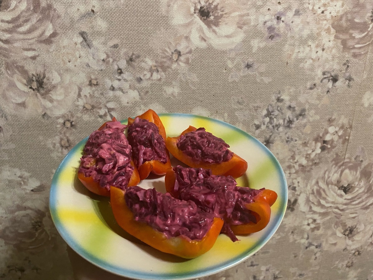 Первым делом возьмите болгарский перец и аккуратно удалите его сердцевину, избавившись от семян.Свеклу протрите на терке. Этот шаг придаст салату яркий цвет и насыщенный вкус.Аккуратно нарежьте отварные яйца аналогичным образом.Совместите все ингредиенты в одной миске, добавьте майонез и приправьте солью по вкусу.Тщательно перемешайте, чтобы consistente свеклы, яиц и майонеза соединялись в однородную массу.Теперь нарежьте перец по ребрышкам и начините его получившейся начинкой.Таким образом, ваш необычный и красочный закусочный салат готов к подаче!