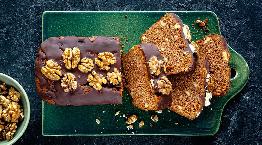 Кекс может подаваться как теплым, так и полностью остывшим. При желании, верхушку можно покрыть шоколадной глазурью и украсить половинками орехов. Для разнообразия, под кексом можно смажьте кисловатым джемом.