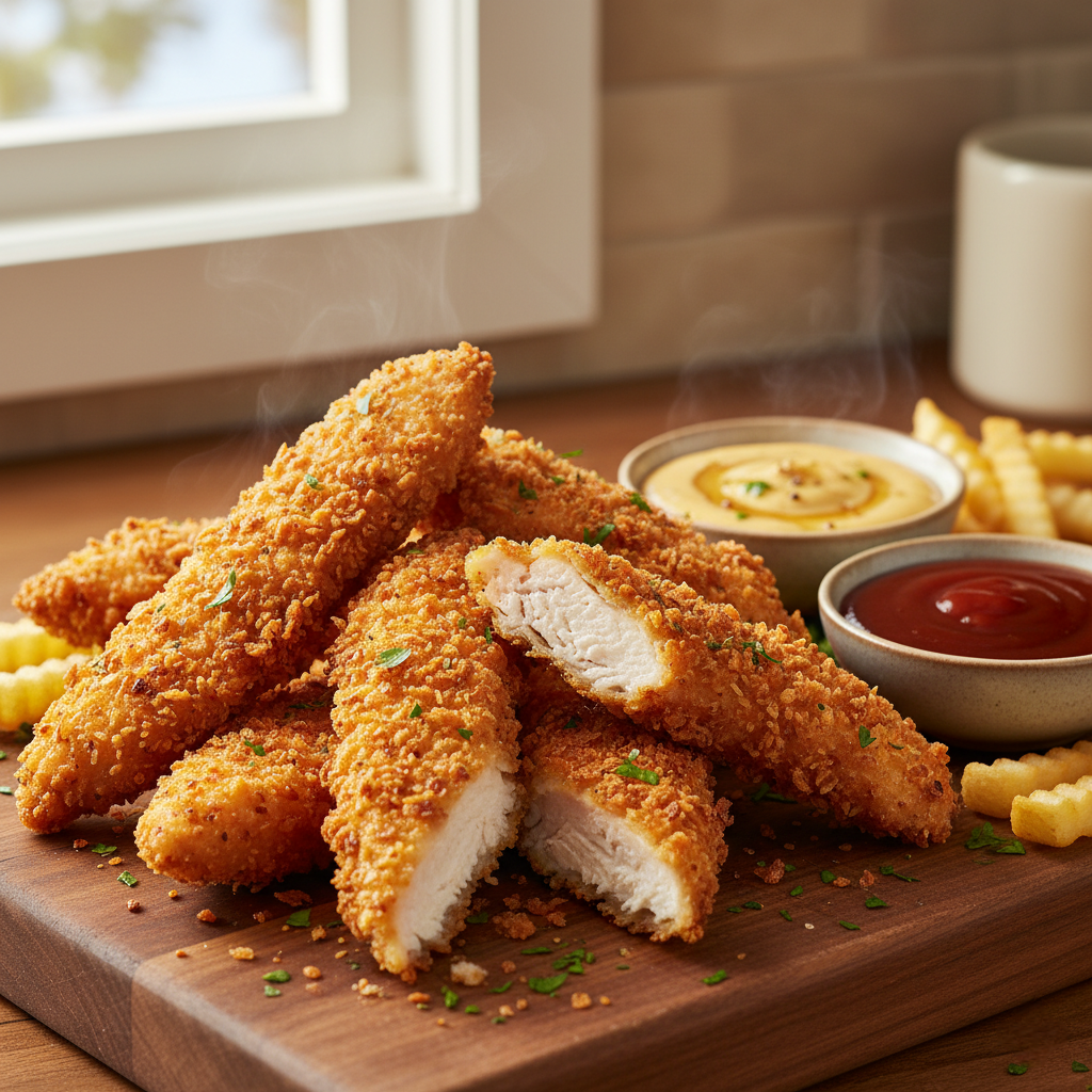 Хрустящие куриные стрипсы — это непревзойденное сочетание нежного куриного филе и аппетитной золотистой корочки. Благодаря маринаду на основе пахты куриное мясо становится невероятно мягким и сочным. Однако именно двойная панировка из сухарей Панко создает тот самый восхитительный хруст, о котором мечтает каждый гурман. Это идеальное блюдо для уютного вечера с друзьями или для семейного ужина!