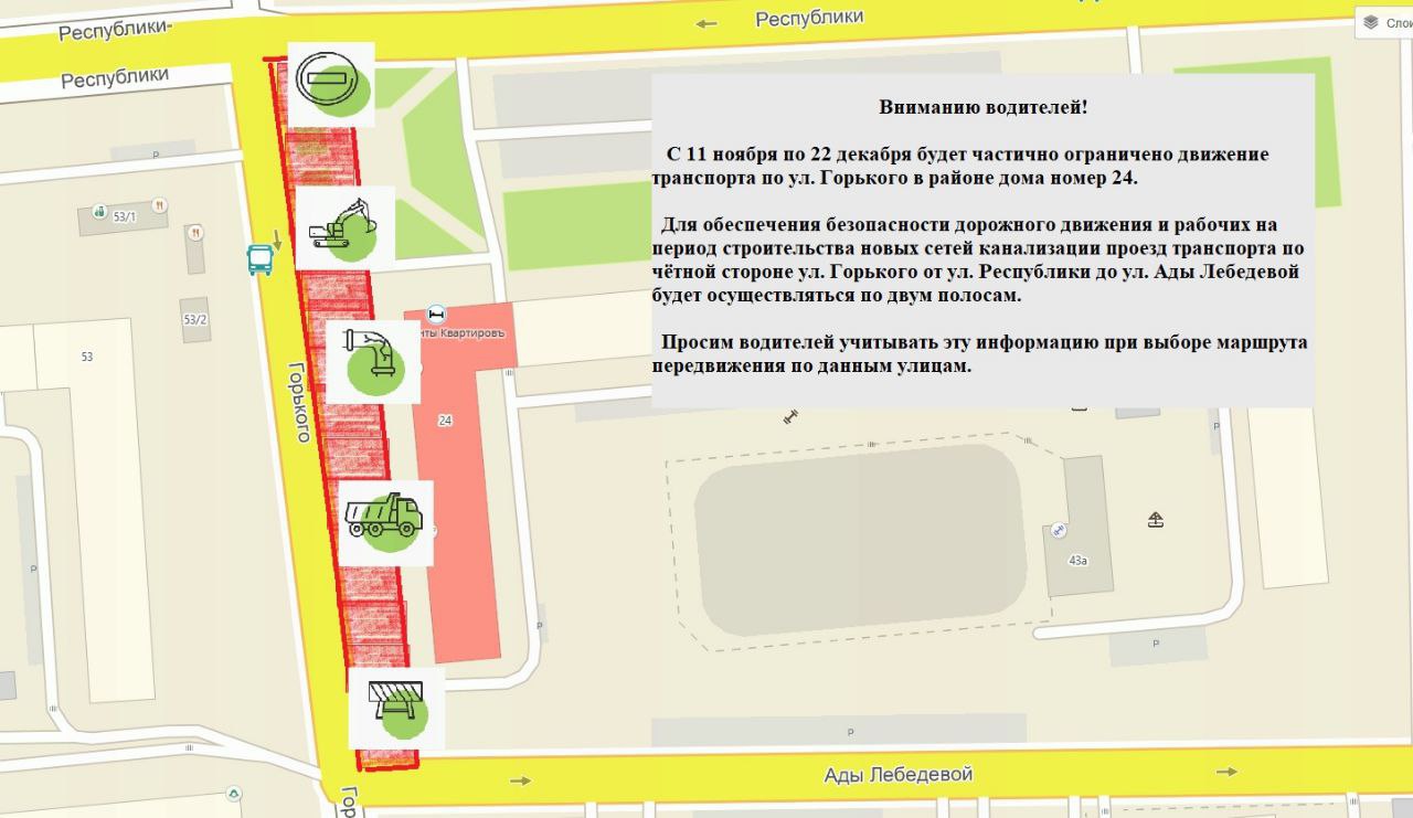 С 11 ноября до 22 декабря движение ограничат около дома № 24. Дорогу сузят до двух полос по четной стороне от улицы Республики до улицы Ады Лебедевой. Также перекроют и проезды к дому на Республики, 43.