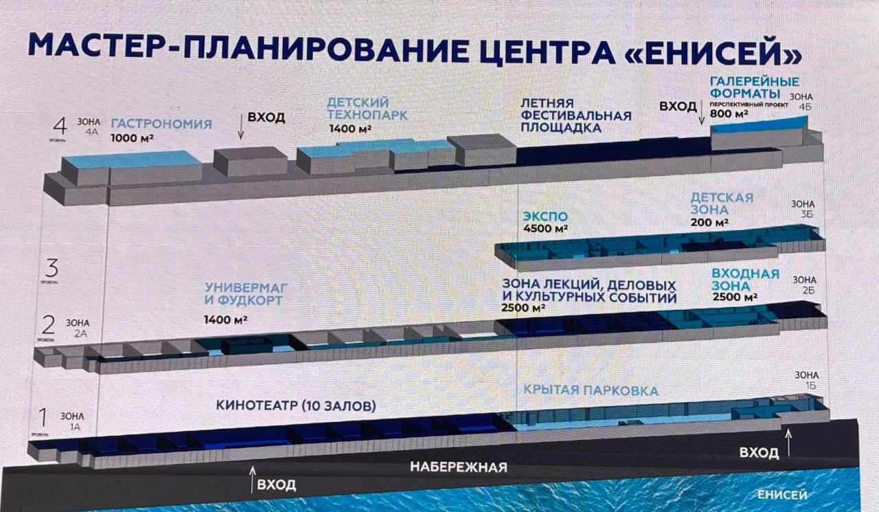 Уже в декабре галерея «Енисей» объединит под одной крышей выставки, лекции, мастер-классы, фудкорт и даже театр. Здание площадью более 40 тыс. кв. м разделят на четыре этажа: экспозиции займут 4500 кв. м, деловые и культурные мероприятия – 2500 кв. м, столько же – входная зона. На крыше обустроят прогулочную террасу с малой сценой и панорамой на Енисей.