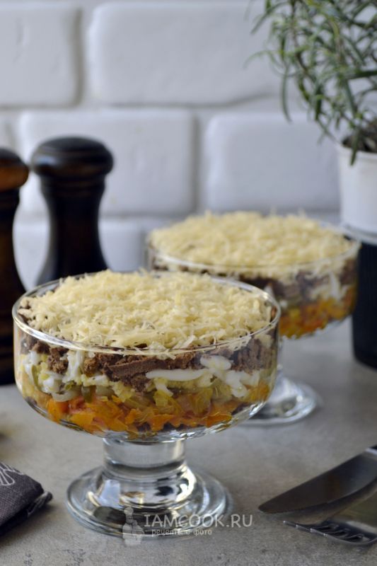 Первый слой — натёртая печень, который нужно покрыть майонезом. Затем аккуратно выложить жареную морковь с луком, добавив свежесть маринованного огурца. Далее следуют воздушные яйца, ещё один слой печени и наконец — потертый сыр. Не забывайте про майонез: каждый слой должен быть аккуратно промазан, создавая нежную текстуру.