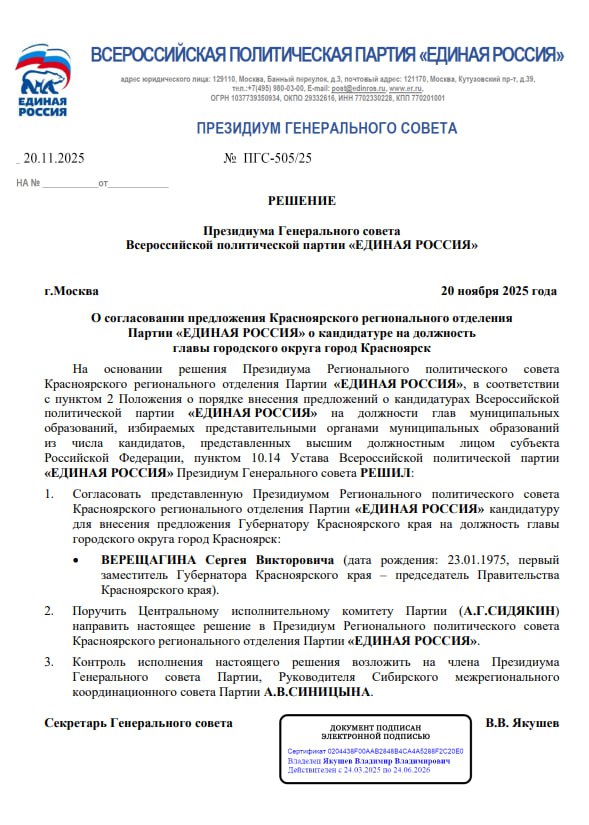 Кандидатуру Верещагина на пост мэра согласовал Генеральный совет «Единой России». Документ подписали в Москве 20 ноября. Далее выдвижение Верещагина на пост главы города предложат губернатору Михаилу Котюкову.
