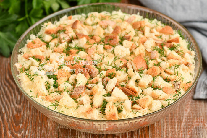 Предварительно овощи отварить и остудить. Лук обжарить до золотистого цвета. Яйца разделить на белки и желтки, а рыбу измельчить. Сборка начинается с белков, которые перемазываются майонезом. Далее идёт слой из рыбы, украшенный жареным луком и морковью. Завершается салат посыпкой из желтков и сухариков перед подачей — это добавит хруст и изюминку.