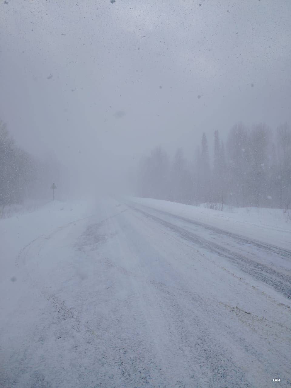 На трассе идет снег, покрытие скользкое, местами видимость почти пропадает — водителям приходится сбрасывать скорость и ехать осторожнее.