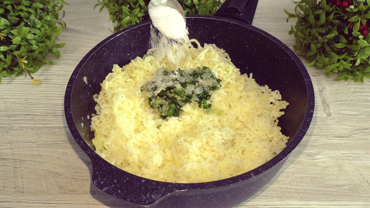 Сначала займёмся начинкой. Картофель отварить до готовности, не добавляя соли, затем тщательно размять его в пюре. В это время мелко нарезать лук и обжарить его на растительном масле до золотистого цвета. Когда лук будет готов, его следует добавить в картофельное пюре вместе с мелко нарезанной зеленью. Для улучшения вкуса посолить и поперчить по вкусу. Рекомендуется также добавить несколько ложек отвара от картофеля для большей сочности.