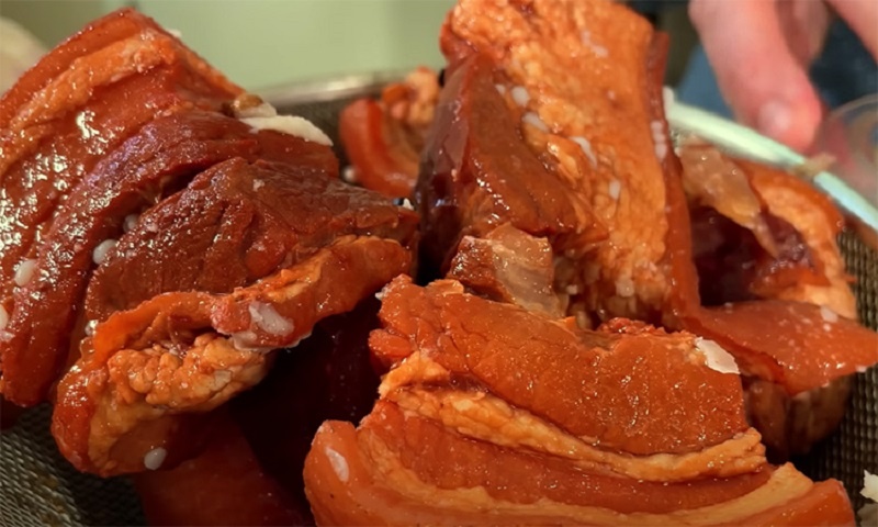 Когда рассол охладится, следует убедиться, что сало полностью погружено в жидкость. На следующем этапе оно должно находиться в рассоле в холодильнике или на холодной лоджии в течение суток. Завершив этот процесс, сало можно обсушить, натереть чесноком и засыпать свежемолотым перцем, а затем заморозить на несколько часов для облегчения нарезки.