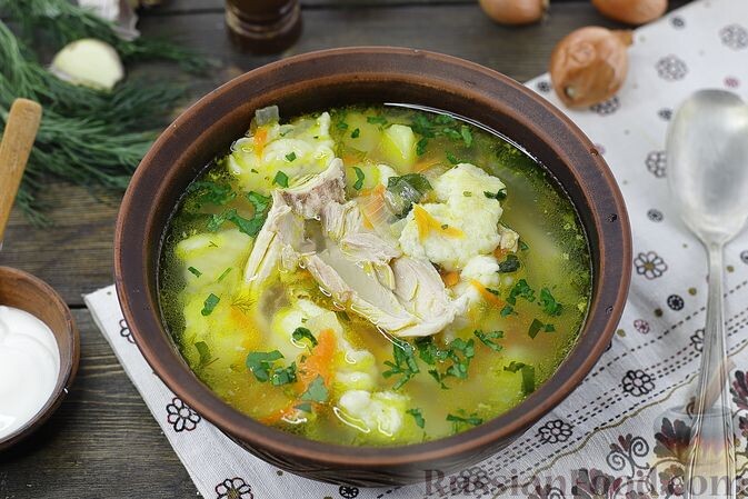 - Куриный суп с клёцками на сметане: Нежный куриный бульон, наполненный свежими овощами и воздушными клёцками, дополненный сметаной для большей кремовости.