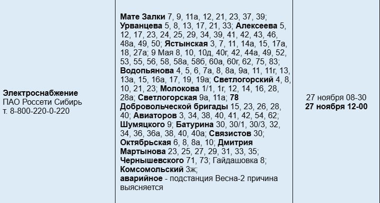 Всего под отключение попало 19 улиц. По информации «Россети Сибирь, электричество пропало из-за технологического нарушения на Весны-2.