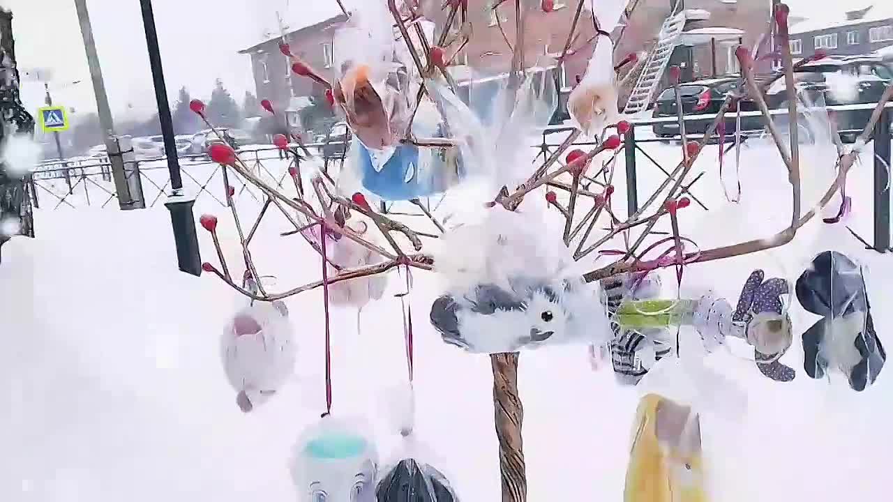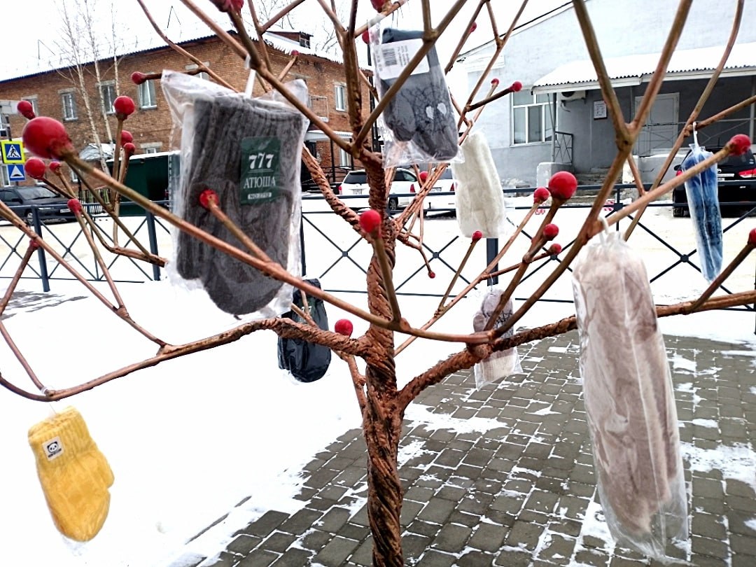 На ветках появилось несколько пар мягких варежек. Любой желающий может забрать их и согреваться в холода.