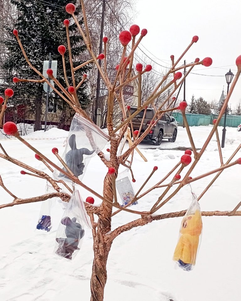 «Дерево добра» стоит возле детской библиотеки почти год и «расцветает» подарками: конфетами, конструкторами, игрушками, сувенирами и самодельными брелочками от ребят.
