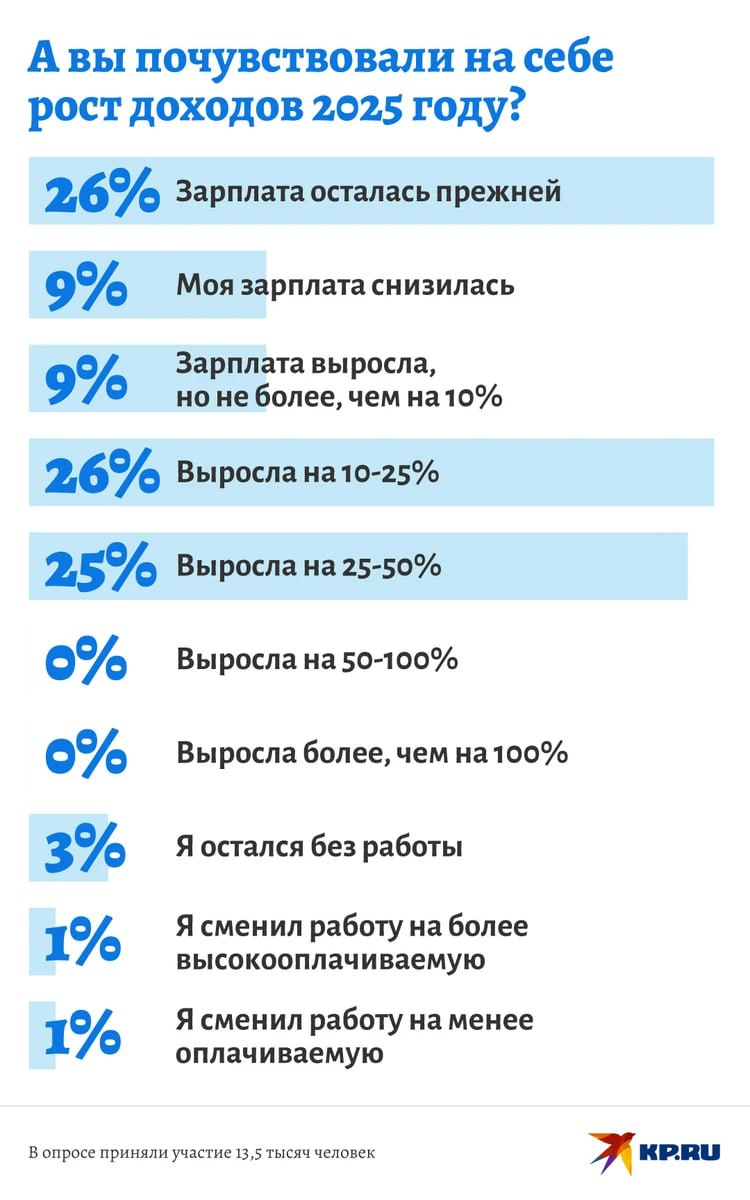 У более половины работающих россиян зарплаты за год выросли на 10% и более. Такие результаты показал опрос, проведенный в соцсетях KP.RU. 26% участников опроса сообщили, что их зарплата за этот год выросла на 26%. (см. графику). Еще четверть опрошенных признались, что рост зарплаты составил 25-50%.