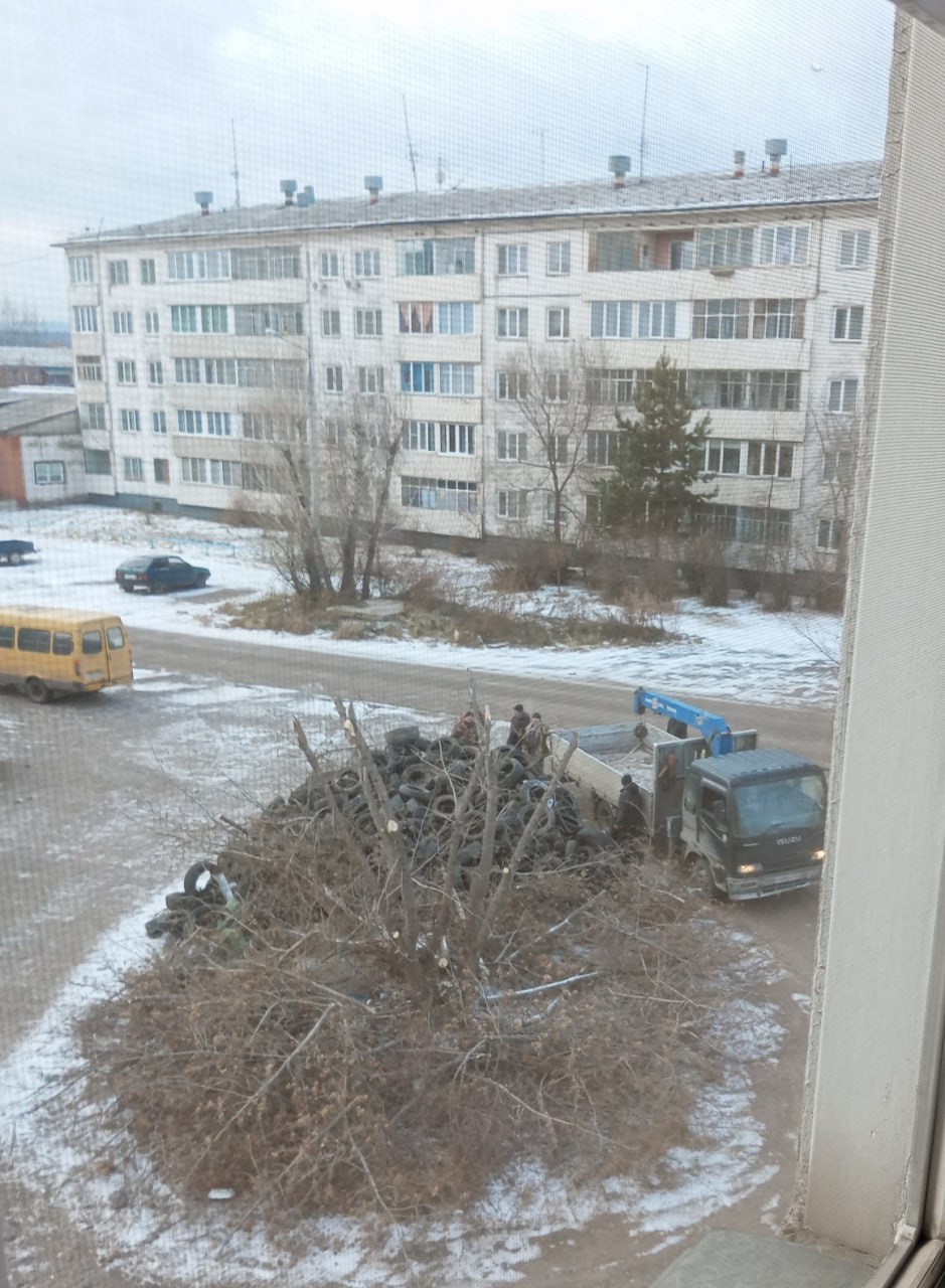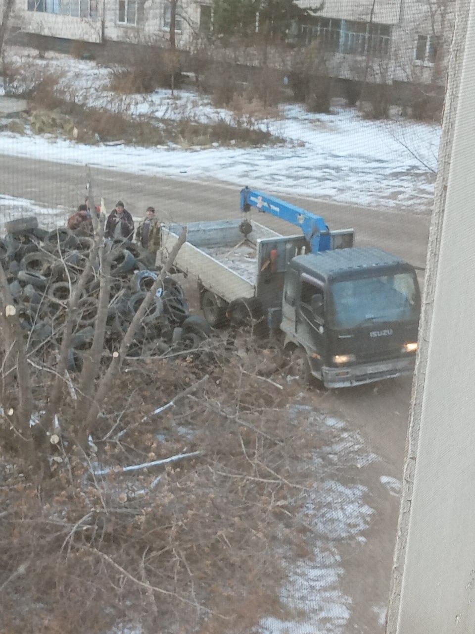 Как сообщают в местной группе, к площадке подъехала грузовая машина и привезла десятки шин.
