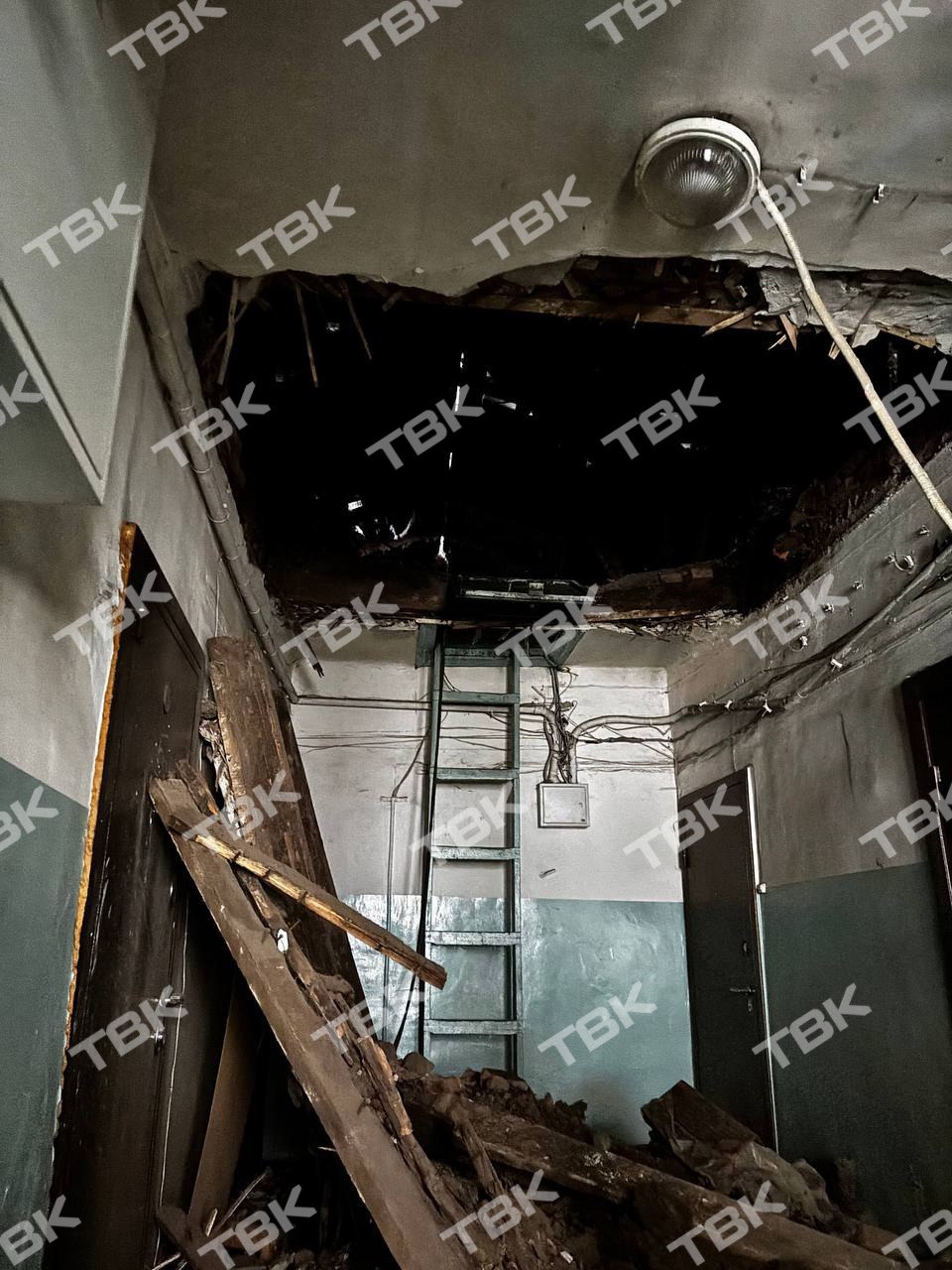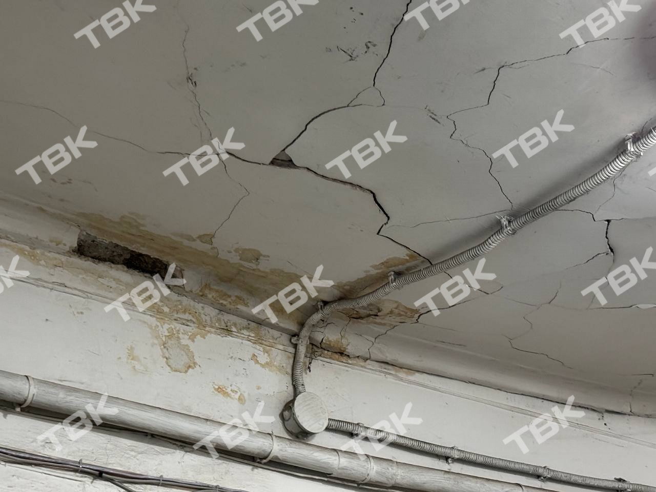 Ранее на потолке уже были трещины, с него капала вода и осыпалась штукатурка. УК у дома сменилась в сентябре, «Ремэй» больше не обслуживает это здание. Представители УК «Ремэй» рассказали ТВК, что в 2025 году заявок на ремонт к ним не поступало.