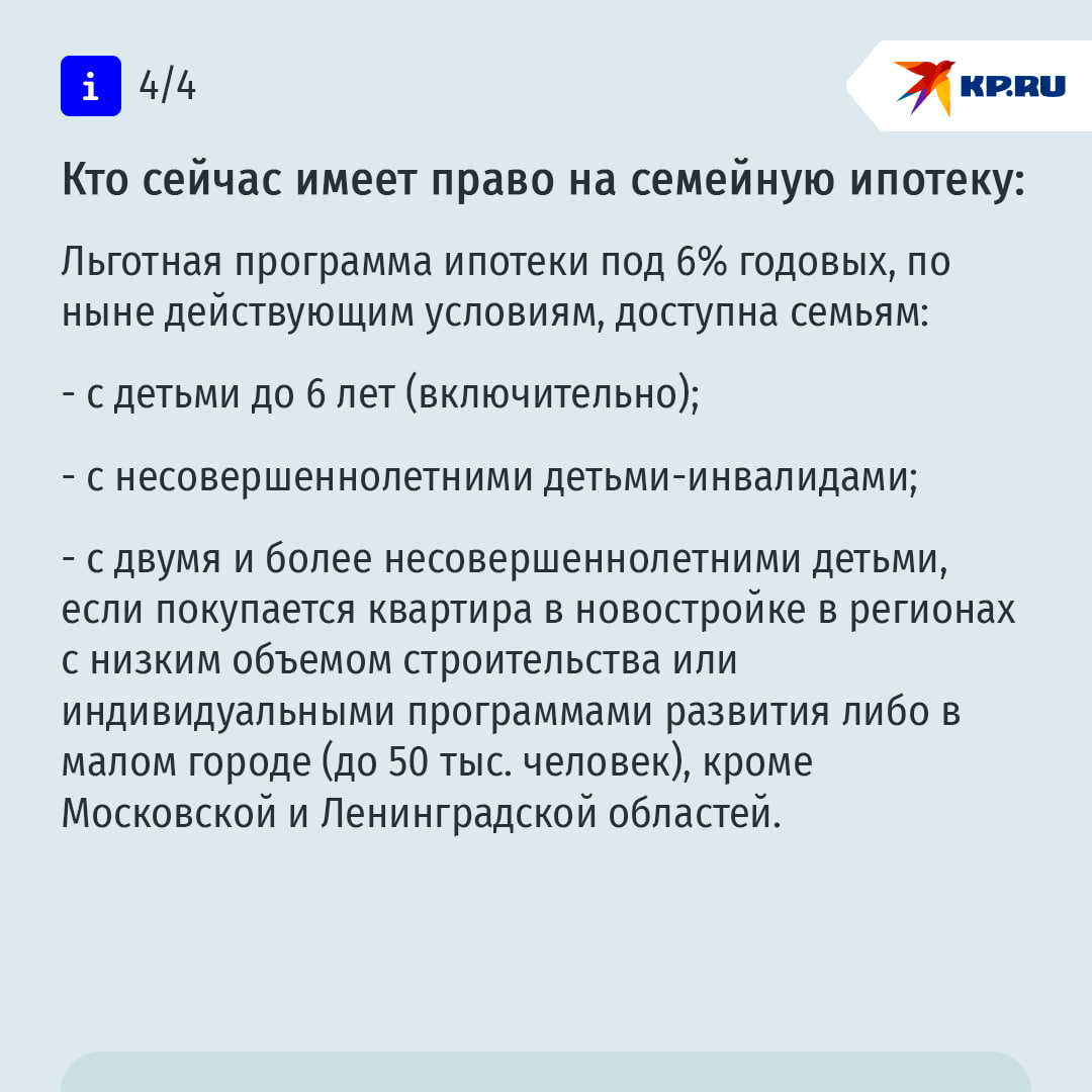А если детей трое или больше и хотя бы одному из них меньше 6 лет, то ставка снижается до 4%.