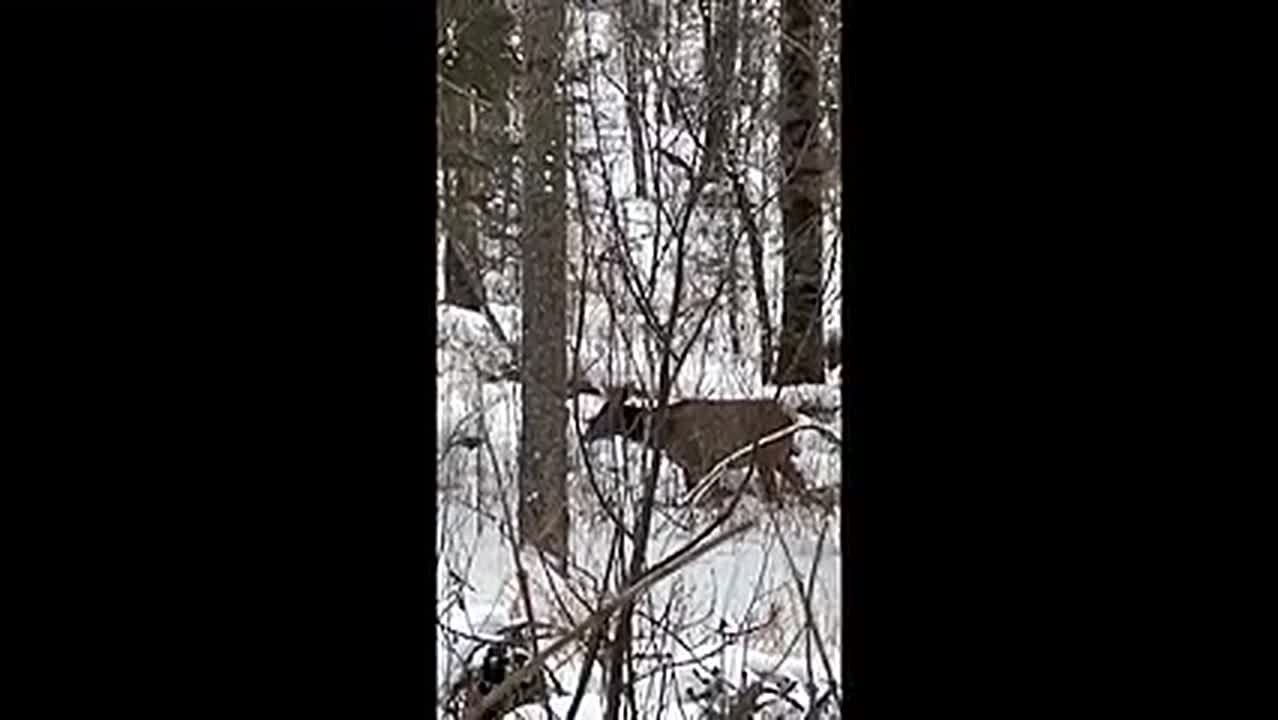 Маралуха прошла в нескольких метрах от людей и не стеснялась камер. Она раскидывала снег и забавно подпрыгивала – не искала лакомства, а просто играла.