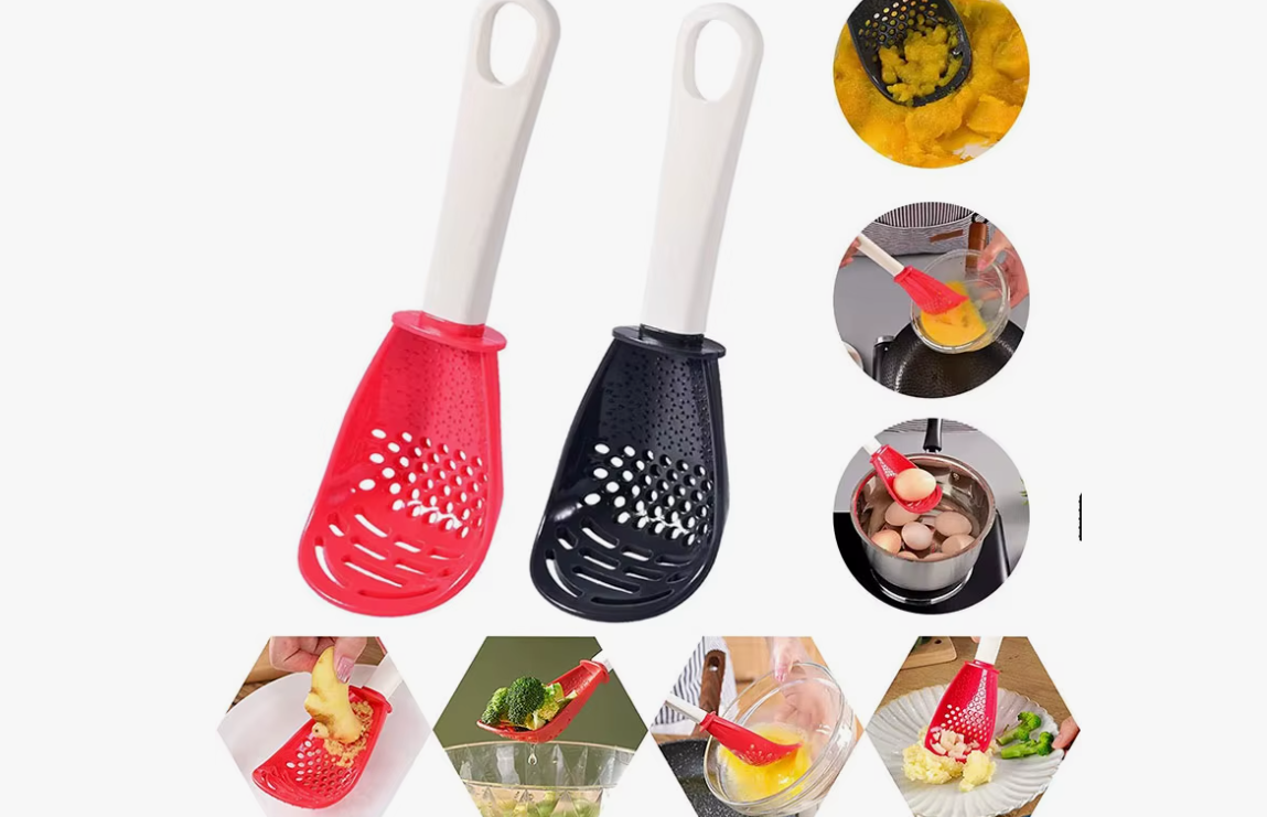 - Многофункциональная ложка 6-в-1. Забудьте о загромождениях на столах — эта ложка заменяет сепаратор для яиц, шумовку и даже терку. Идеальна для извлечения макарон или приготовления детского пюре.