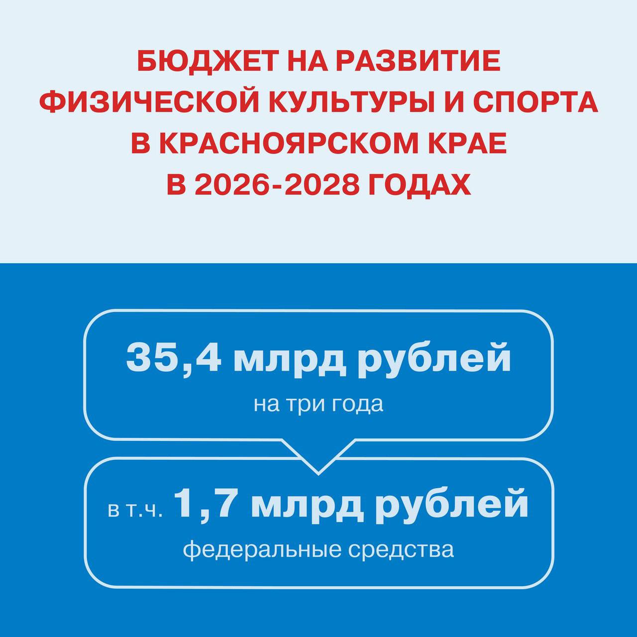 Проект краевого бюджета на три года принят. На развитие спорта и физической культуры заложены 35,4 млрд рублей. В том числе 1,7 млрд рублей федеральные средства.