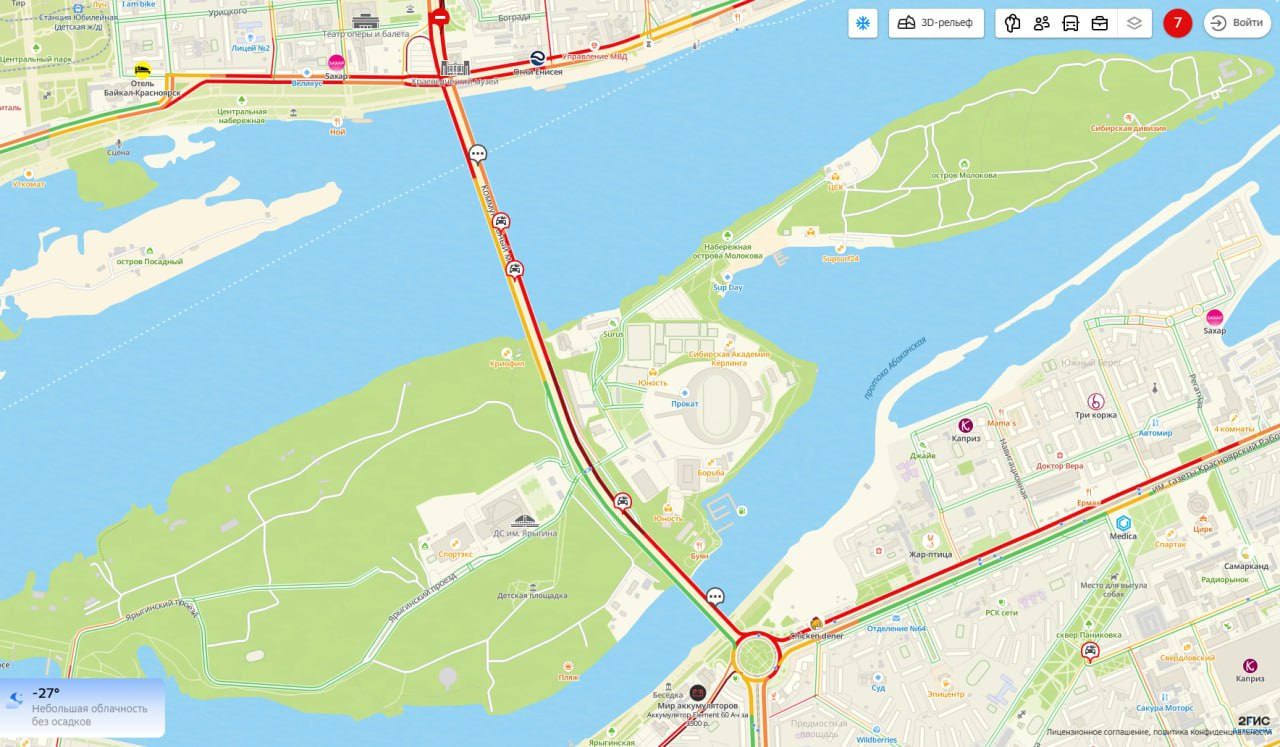 Судя по онлайн-карте, оба ДТП случились в районе острова Отдыха. Сложно проехать от «Цирка» до середины моста. А в целом пробки в городе оценивают в 7 баллов.