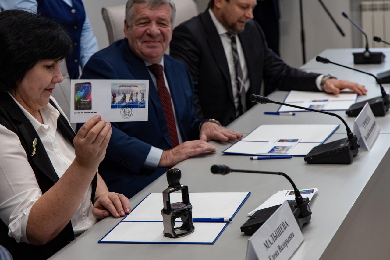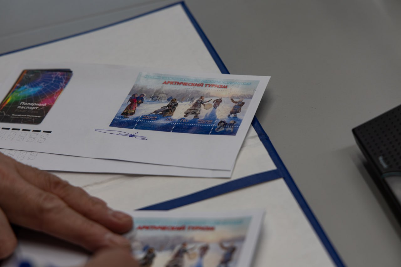 Сегодня прошла торжественная церемония гашения новой почтовой марки из серии «Арктический туризм РФ». В этот раз она посвящена коренным малочисленным народам региона — на марке изображены представители восьми этносов в национальных костюмах на фоне арктического пейзажа.