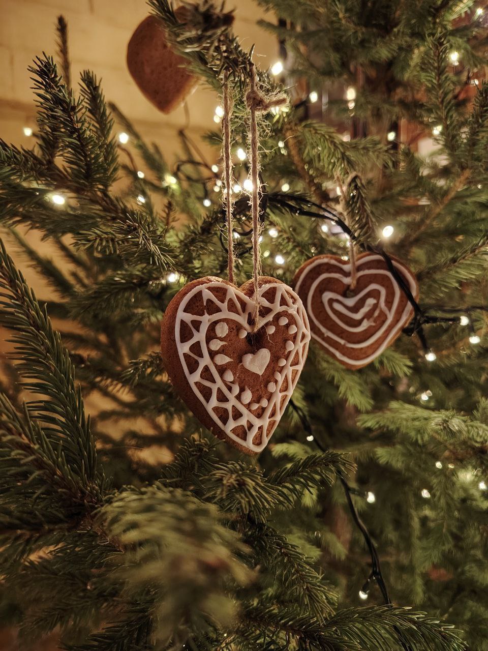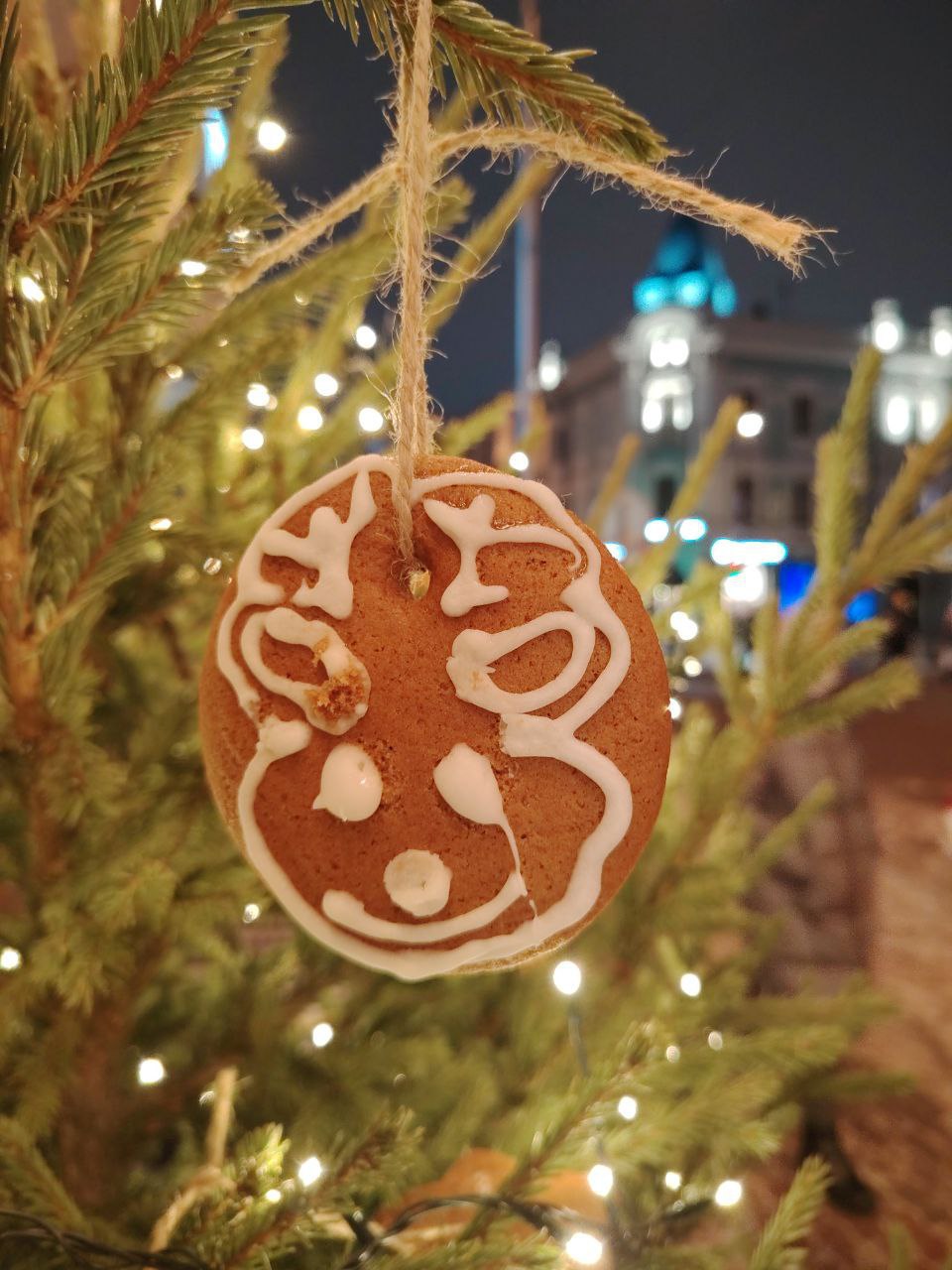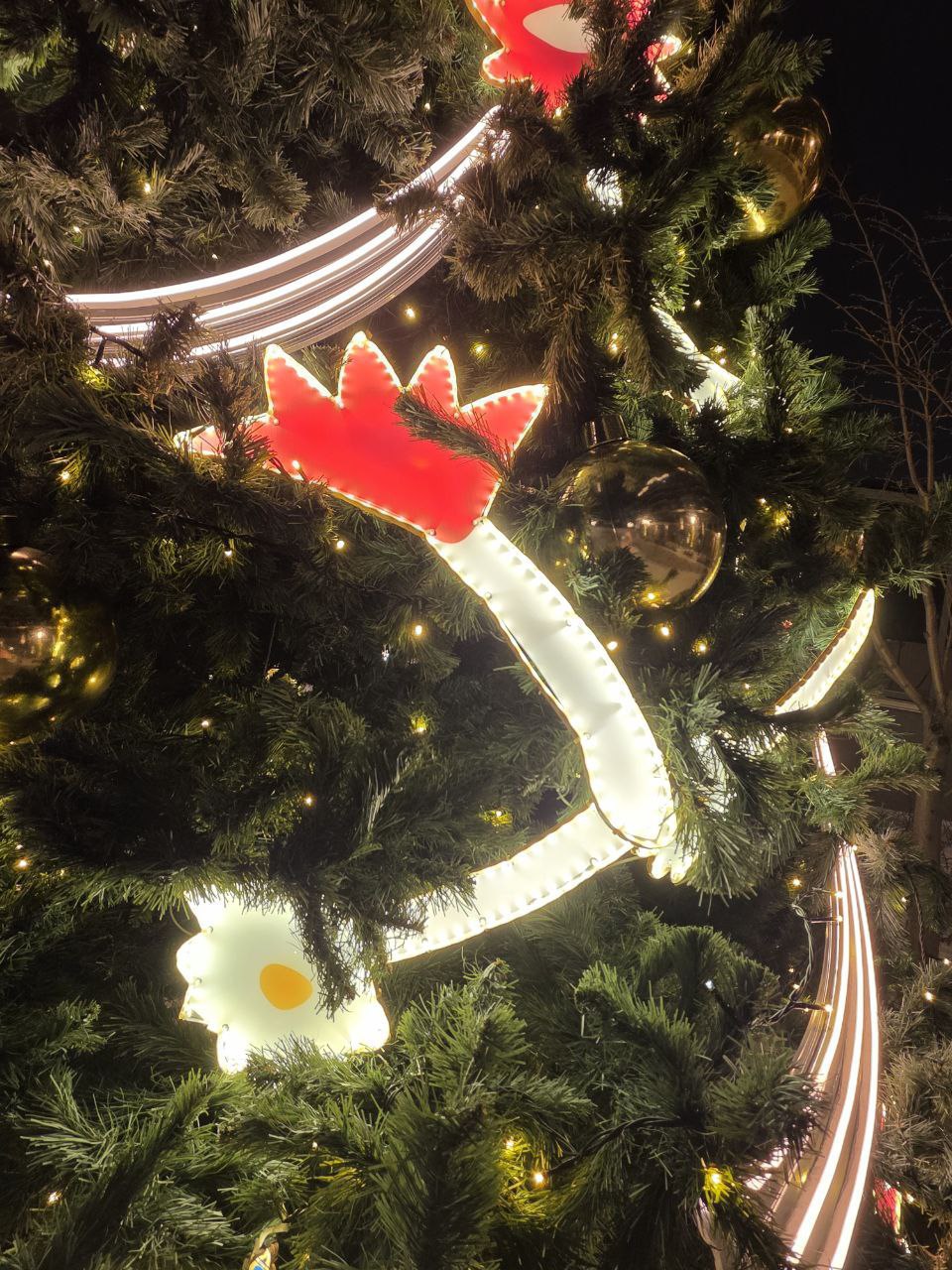 Праздничное дерево украсили цветами ярких оттенков. Еще несколько елок оформили настоящими имбирными пряниками