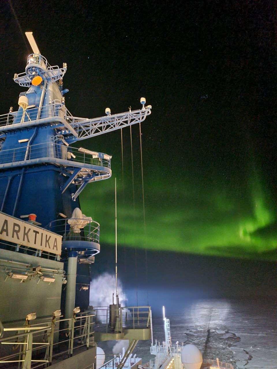 Такие яркие сполохи в небе запечатлела со своего рабочего места второй помощник капитана ледокола "Арктика" Нина Вдовина.