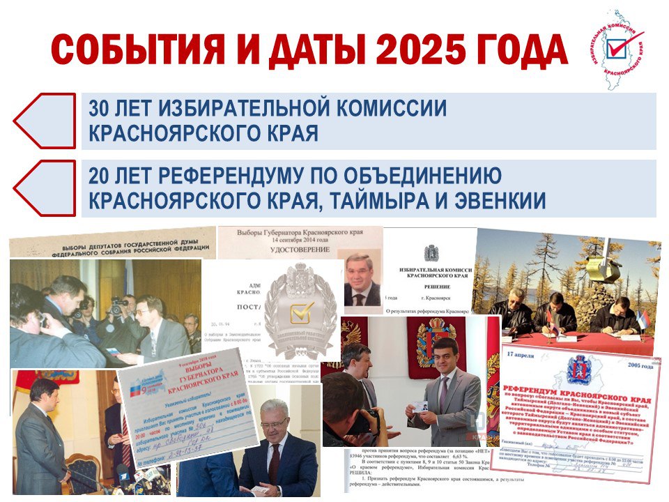 Уходящий год ознаменовался двумя значимыми для избирательной системы региона датами – 30-летие Избирательной комиссии края и 20-летие Референдума по объединению Красноярского края, Таймыра и Эвенкии, в ходе которого избирательные комиссии края и автономных округов выступали в качестве комиссий референдума.