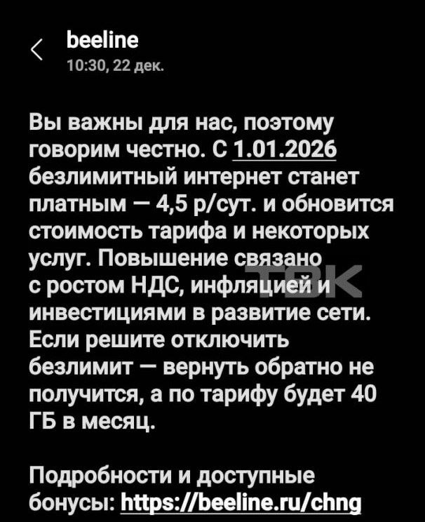 Подписчик ТВК получил предупреждение от оператора «Билайн». С 1 января безлимитный интернет станет платным, а тариф – подорожает.