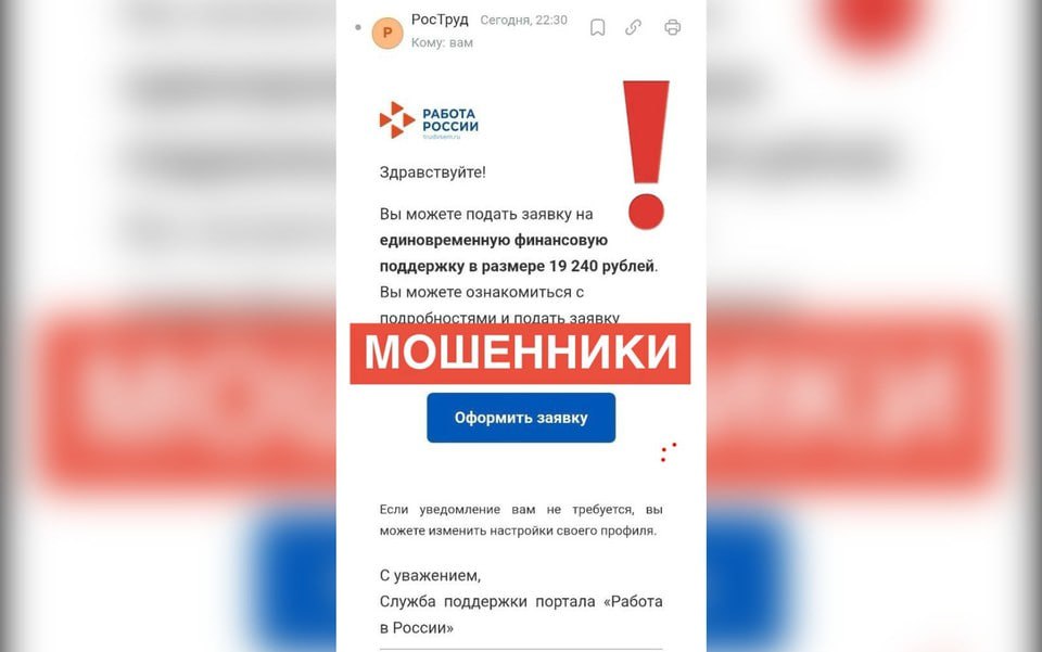 Переходить по ссылке из подобных писем нельзя — так пытаются украсть ваши персональные данные. Помните, что служба занятости не предлагает получить какие-то выплаты просто так — все меры государственной поддержки назначаются индивидуально.