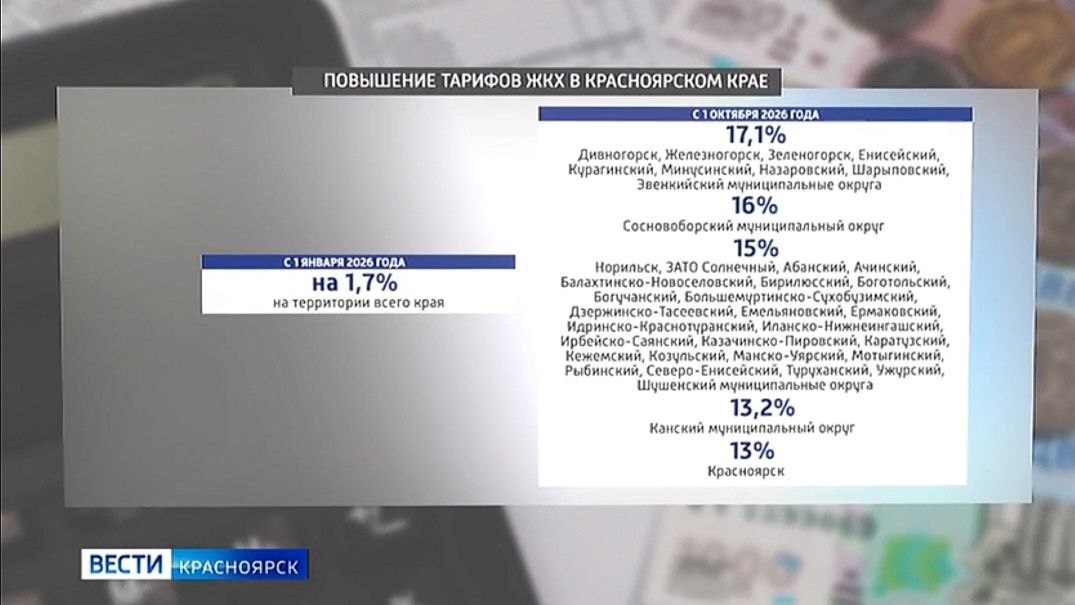 Губернатор Красноярского края подписал указ о повышении тарифов ЖКХ. Так с 1 января 2026 года на всей территории региона, плата вырастет на 1,7 процента. Следующее повышение запланировано на октябрь. В разных муниципальных округах, рост составит от 13 до 17 процентов.